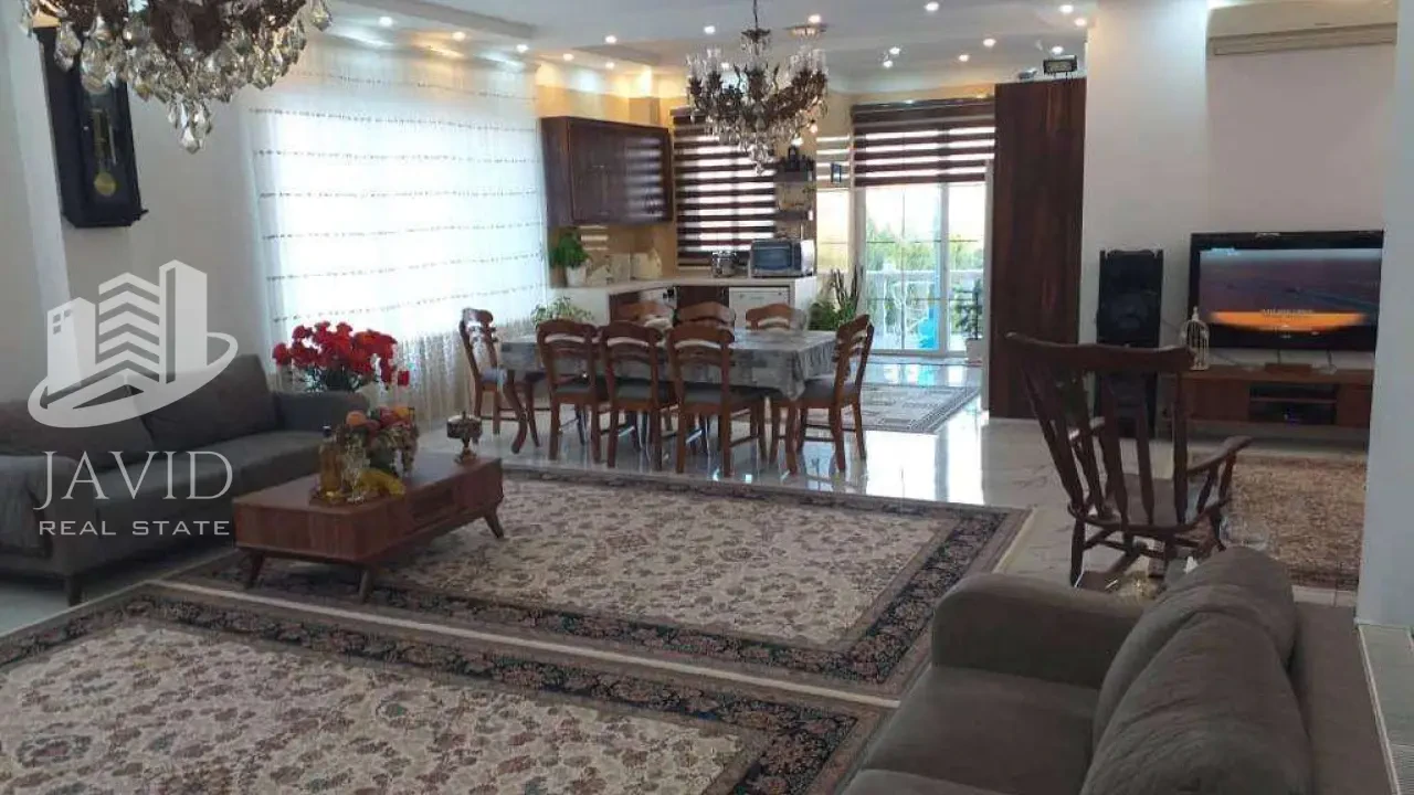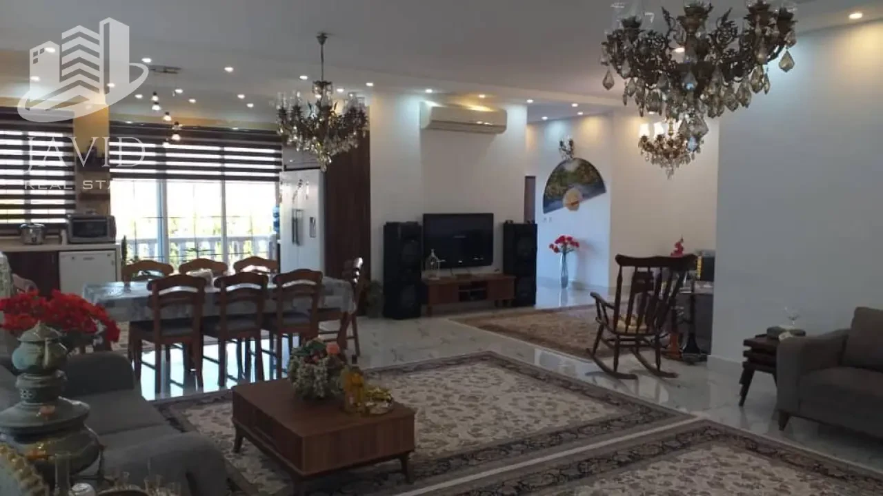 دارای ۴ خواب مستر، استخر و جکوزی خصوصی، آشپزخانه هایگلس با گاز رومیزی و هود، کف سرامیک و نمای سنگی.